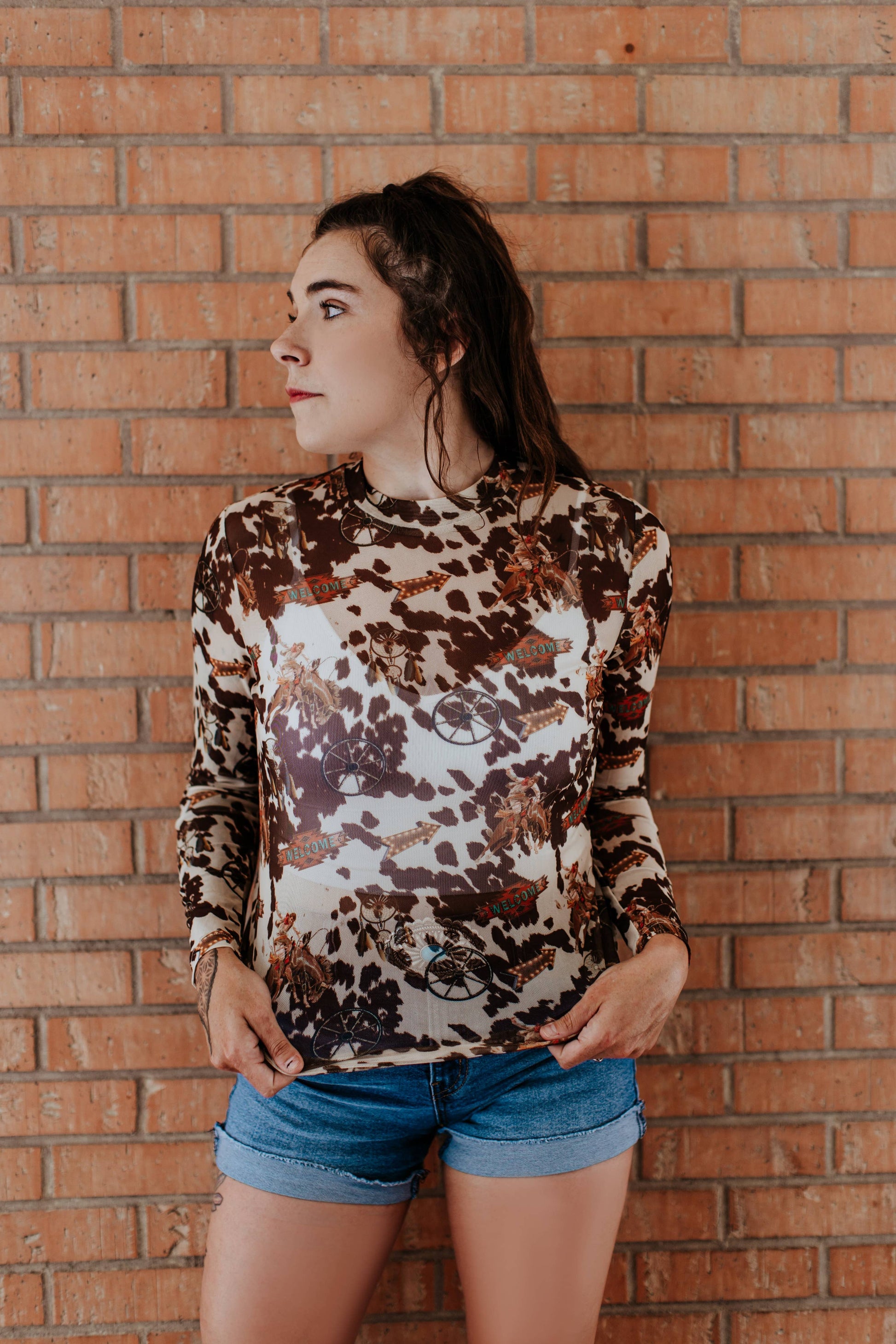 This trendy stretchy mesh fabric is the perfect fit for this coming Fall. Welcome this buckin' horse cowhide pattern. Long sleeves which makes it suitable for cooler weather while maintaining a stylish appeal!