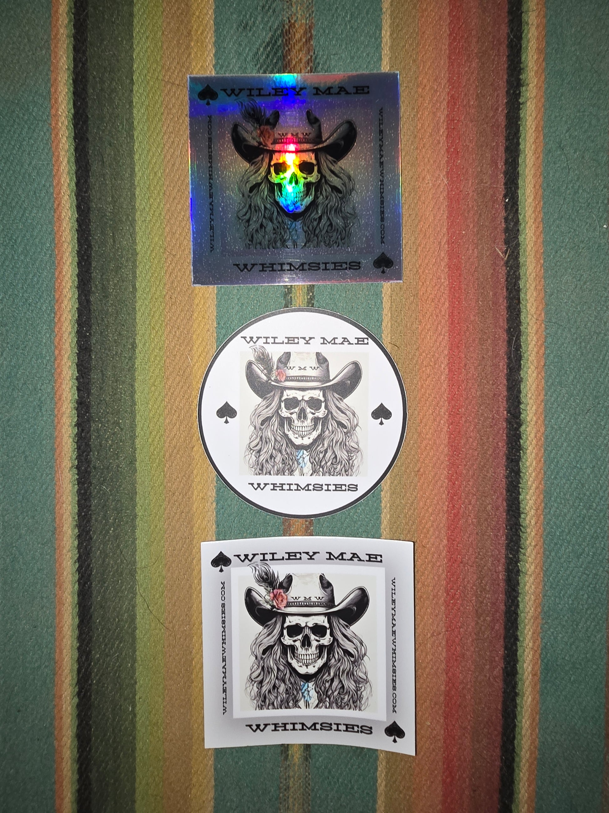 Represent your new favorite brand with our custom Wiley Mae Whimsies Skull Logo 3x3 Circle sticker. This round logo sticker features thick, durable, vinyl protecting it from scratches, water, and sunlight so you can represent WMW wherever you go. Add it to your laptop, tumbler, journal, and more!